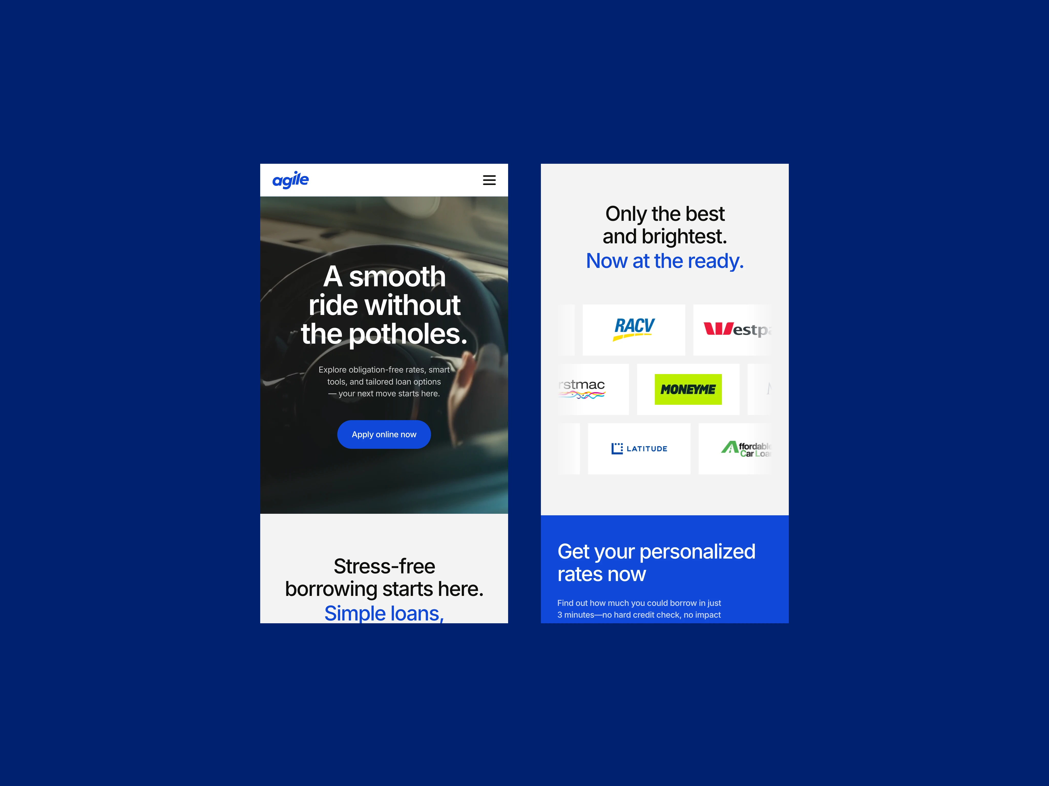 Agile Brokers needed a refreshed brand and website that could better communicate their values of professionalism, friendliness, and trust. I was responsible for reimagining their visual identity and digital experience — including a custom loan calculator, CRM integration and some light merchandise visualisation.